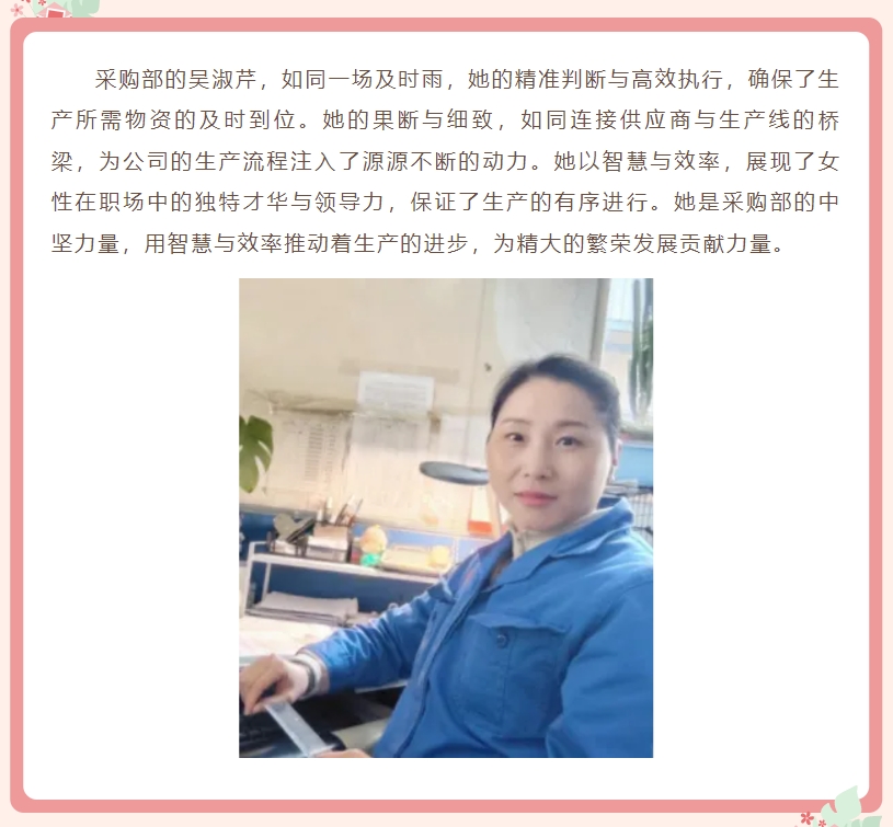 在這個春意盎然、萬物復蘇的美好時節(jié),我們迎來了三八婦女節(jié),請讓我們的目光深情地投向那些在公司各個崗位默默耕耘、熠熠生輝的女性員工。她們以卓越的專業(yè)技能為精大的蓬勃發(fā)展添磚加瓦,更以獨特的女性魅力,在職場上綻放出一抹抹絢爛的光彩,猶如璀璨星辰,照亮前行的道路。