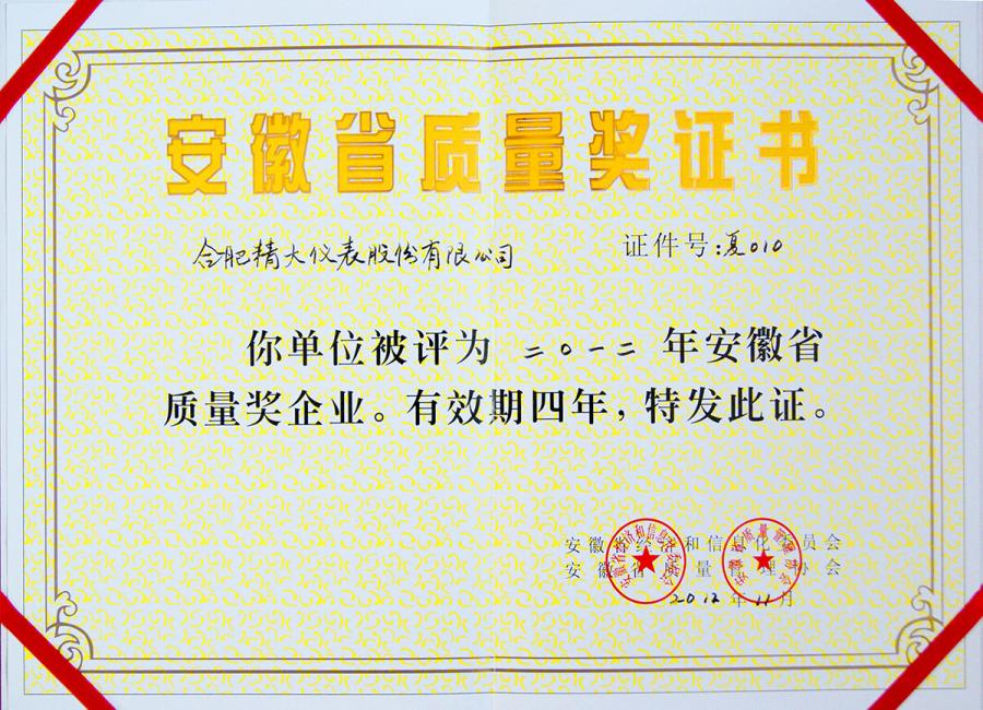 安徽省質(zhì)量獎(jiǎng)證書(shū)